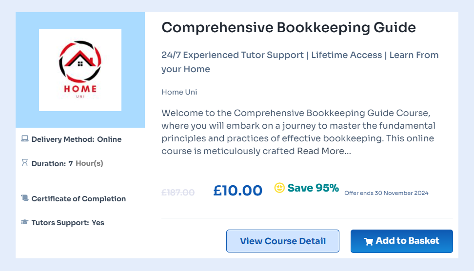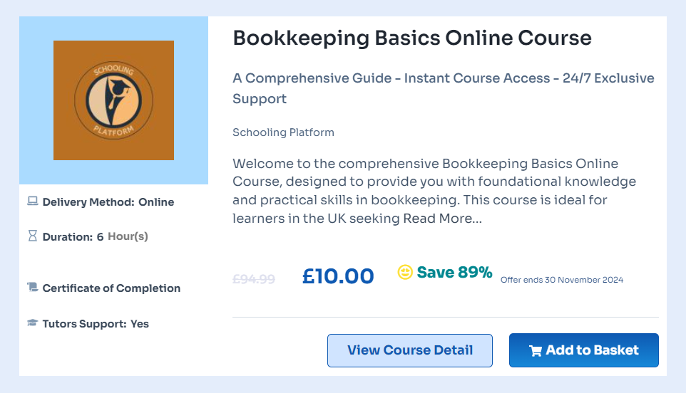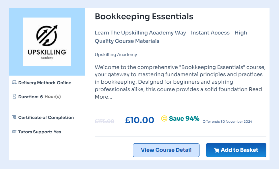 The Bookkeeping Basics Online Course offers foundational knowledge and practical skills in financial record-keeping. It covers essential topics like double-entry bookkeeping and ledger management, ideal for learners in the UK. With expert-led instruction and practical exercises, this course equips you to confidently handle bookkeeping tasks. It also enhances your professional growth in accounting and finance.