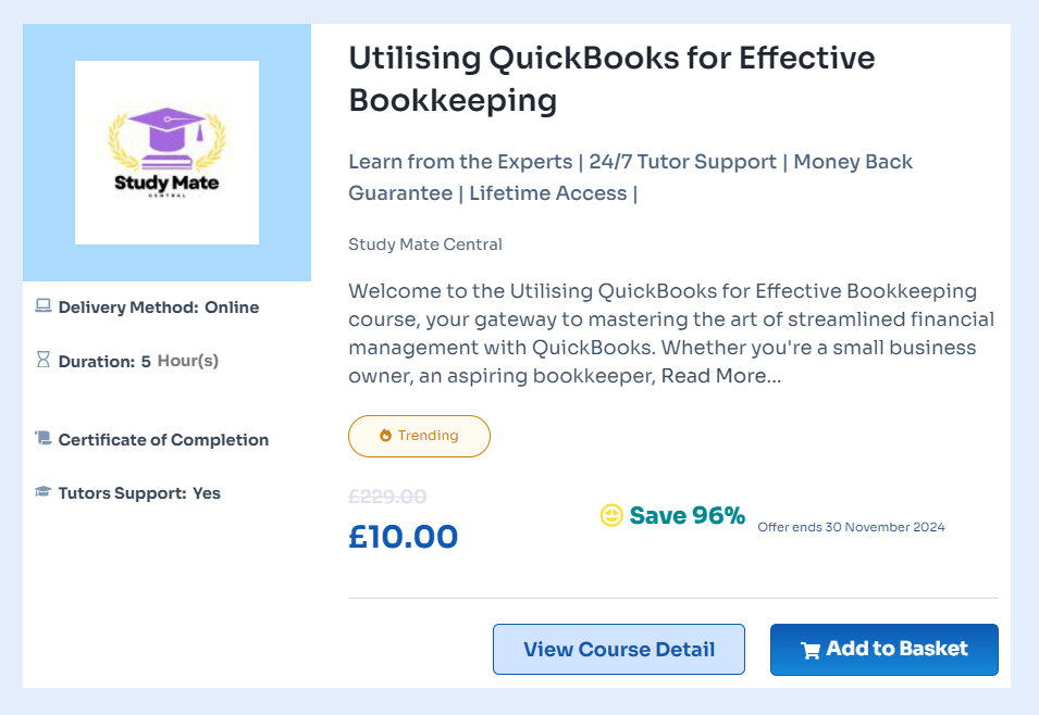 The Utilising QuickBooks for Effective Bookkeeping course equips learners with practical knowledge to streamline financial management. It covers essential topics like transaction recording, financial reporting, and payroll processing. Designed for beginners, professionals, and students, the course provides a comprehensive foundation in bookkeeping. It also offers advanced insights to enhance skills using QuickBooks.