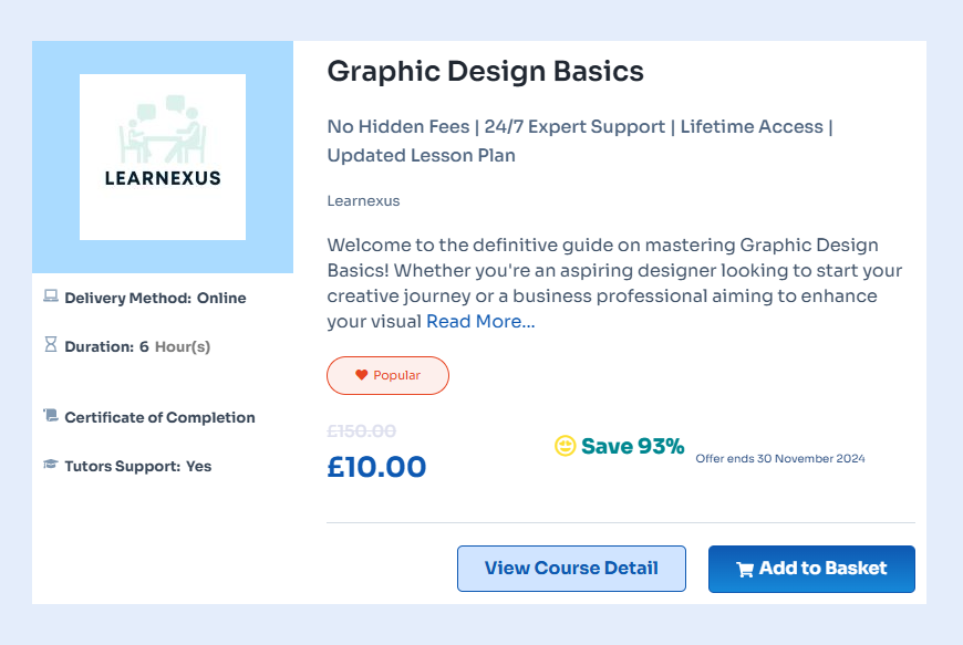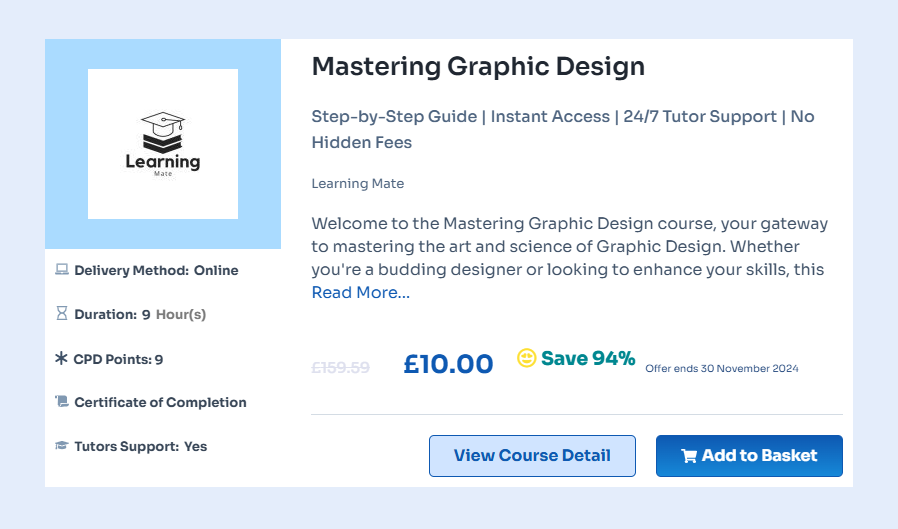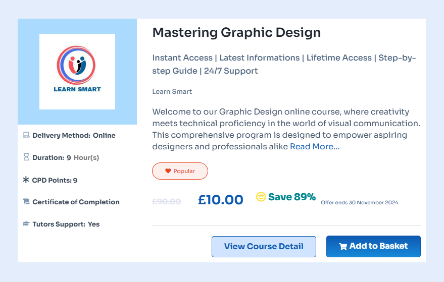 The Mastering Graphic Design course from Learning Mate is a comprehensive online program designed for both beginners and experienced designers. This course covers essential graphic design principles, including color theory, typography, and composition, allowing you to create visually compelling concepts. You’ll gain hands-on experience with industry-standard tools through video lectures, practical assignments, and interactive quizzes, all from the comfort of your home.