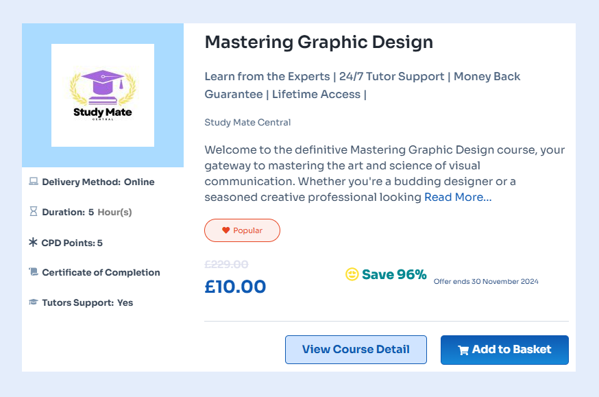 Choosing the Mastering Graphic Design course equips you with a robust skill set, blending foundational knowledge with advanced techniques. With expert instruction from seasoned professionals, you’ll receive insights that are both practical and industry-relevant. The flexible format allows you to learn at your own pace while engaging with a community of fellow learners for support and collaboration. Additionally, the hands-on projects ensure you apply what you learn to real-world challenges, helping you build a stellar portfolio that showcases your creativity and technical skills. This course not only prepares you for various career opportunities in graphic design but also positions you as a competitive candidate in the job market.