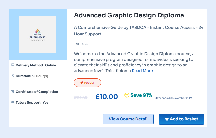 The Advanced Graphic Design Diploma is an in-depth program designed for individuals looking to elevate their graphic design skills to an advanced level. This course covers advanced techniques, industry best practices, and creative methodologies essential for success in the dynamic field of graphic design. Participants will engage with topics such as advanced design principles, creative concept development, and digital tools, all aimed at creating a robust portfolio that showcases their mastery.