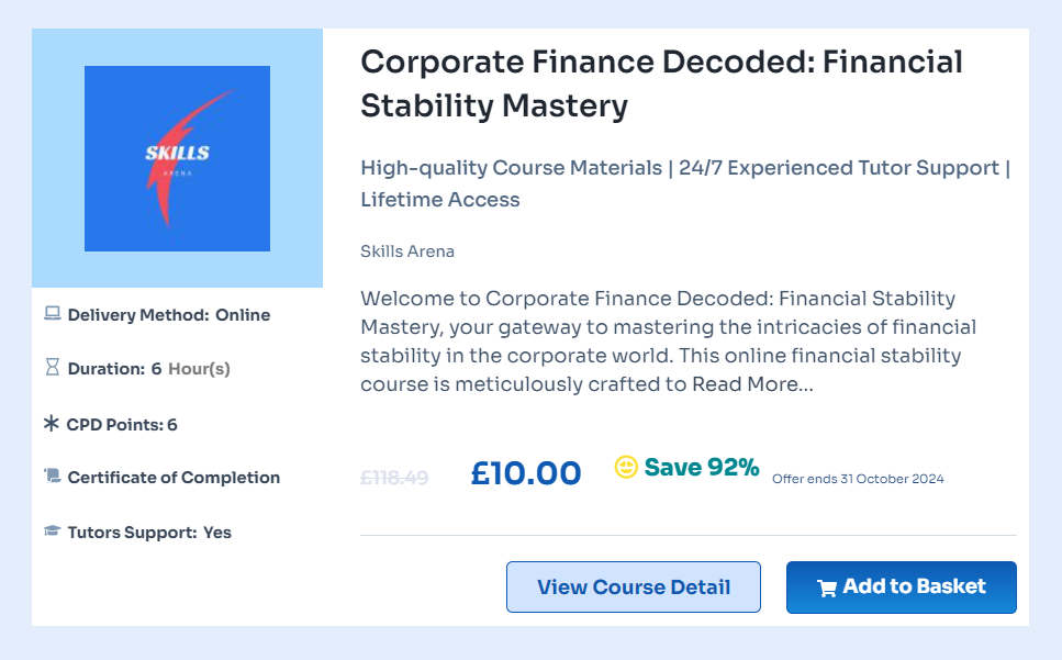 Unlock your potential with Skills Arena’s Corporate Finance Decoded: Financial Stability Mastery course, designed to provide essential skills and industry knowledge. Benefit from expert mentorship and practical insights to thrive in today’s job market.