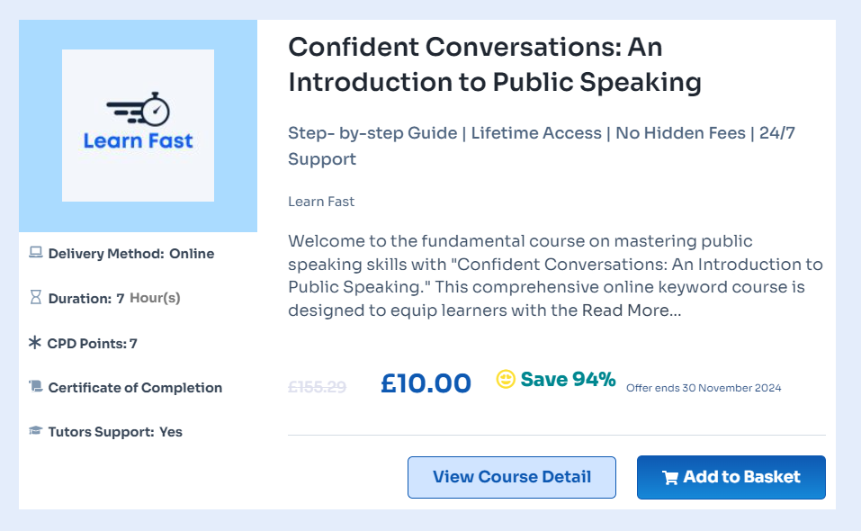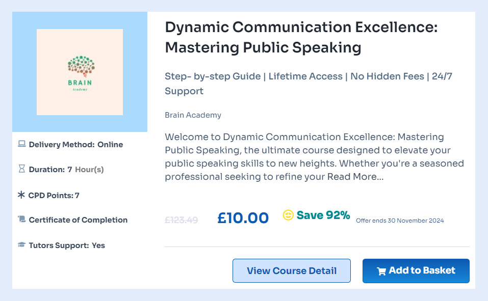 If you’re passionate about enhancing your communication skills and captivating your audience, take action now! Enrol in the Top 10 Online Public Speaking Course in the UK to transform your passion for effective communication into a powerful skill set. These courses are designed to provide you with essential techniques and strategies to enhance your public speaking abilities, whether you’re a beginner or looking to refine your existing skills. Through professional training, you will learn everything from structuring your speeches to mastering body language and vocal delivery. Each course offers practical exercises and expert feedback, helping you build confidence and presence in front of any audience.