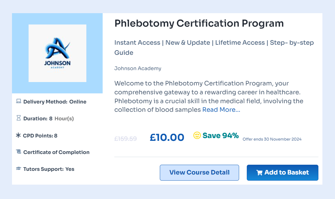 The Phlebotomy Online Course from Skills for Jobs is a concise yet comprehensive program designed to provide foundational and advanced knowledge in phlebotomy. With a duration of just 2.5 hours, this course offers lifetime access to materials, making it perfect for busy learners who want to study anytime, anywhere. Whether you’re a beginner or a professional looking to refine your skills, this course offers a structured approach that equips you with practical techniques essential for success in the field.