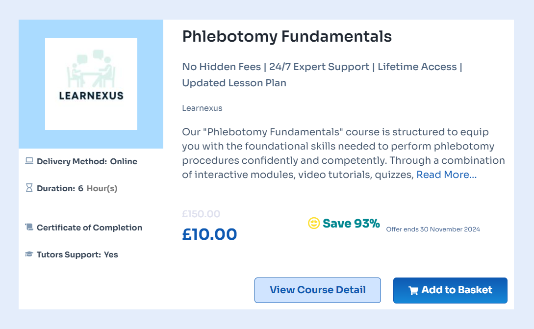 The Fundamentals of Phlebotomy course is an excellent investment for anyone looking to enter or advance in the healthcare industry. With its comprehensive curriculum and flexible online format, you can study independently, fitting learning around your personal and professional commitments. The course provides not only theoretical knowledge but also practical skills through engaging simulations and exercises, ensuring you gain the confidence needed to perform blood collection competently. By completing this course, you will position yourself as a knowledgeable candidate ready to contribute effectively to patient care in various healthcare settings.