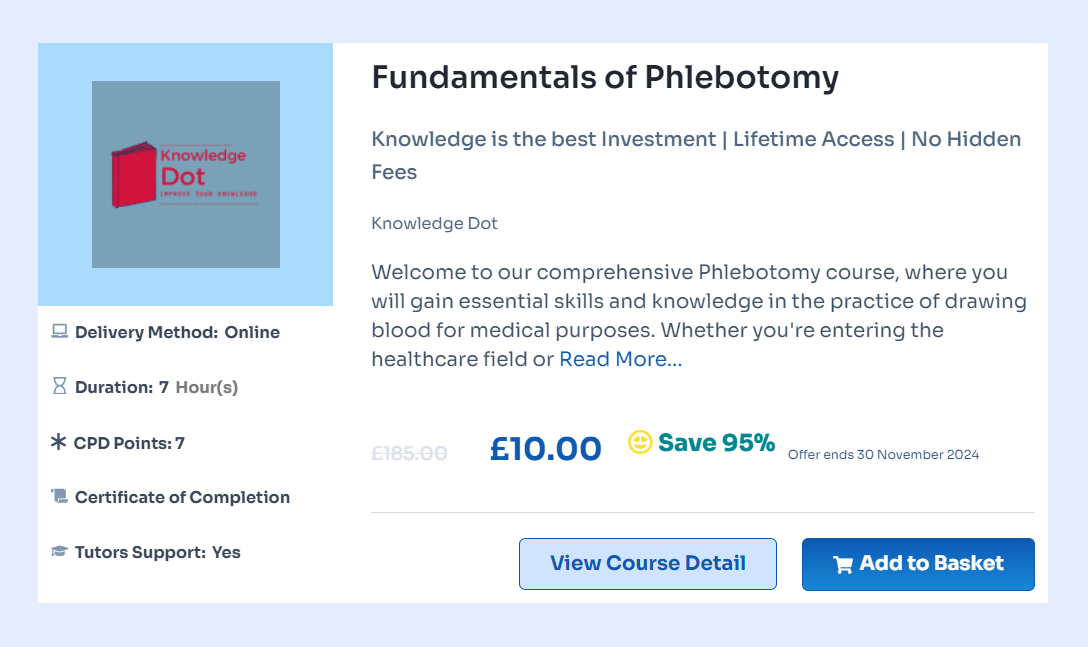 The Fundamentals of Phlebotomy course from Knowledge Dot offers comprehensive training in blood collection techniques, catering to both newcomers and those looking to enhance their expertise in the healthcare field. This online course covers essential topics, including anatomy and physiology of the circulatory system, venipuncture techniques, and infection control measures. Participants engage in practical application through simulated labs and hands-on exercises, ensuring they develop proficiency in blood drawing skills while also learning about patient interaction and safety.