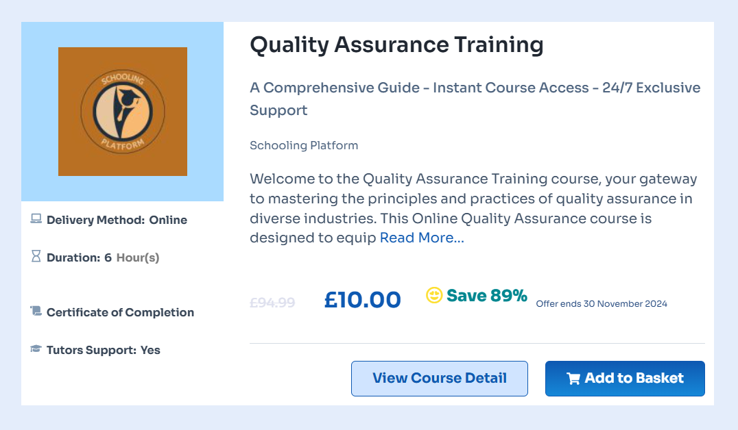 The Quality Assurance Training course offered by Schooling Platform is an essential learning opportunity for anyone seeking to master the principles and practices of quality assurance across diverse industries. This comprehensive online course is tailored to equip both newcomers and seasoned professionals with the necessary skills and knowledge to ensure that products and services meet the highest standards of quality. With an emphasis on practical application, participants will explore the fundamental concepts of quality assurance, encompassing methodologies, tools, and techniques used to monitor and enhance quality throughout the product lifecycle. From manufacturing to service industries, the principles taught in this course are universally applicable, making it a vital resource for those aiming to contribute effectively to organizational success.