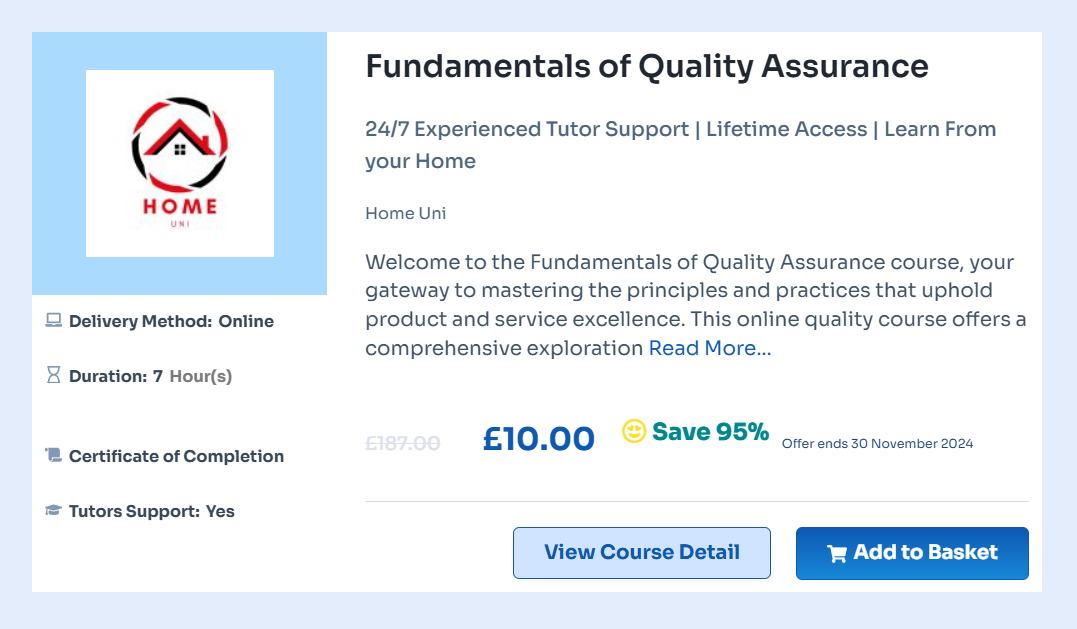 The Fundamentals of Quality Assurance course offered by Home Uni is designed for both aspiring professionals and experienced practitioners looking to deepen their understanding of quality assurance principles. This comprehensive online course emphasizes the essential role of quality management in ensuring customer satisfaction, operational efficiency, and compliance across various industries. Participants will explore key topics such as quality planning, process improvement, risk management, and continuous evaluation, equipping them with the actionable skills needed to drive sustainable improvements in their organizations.