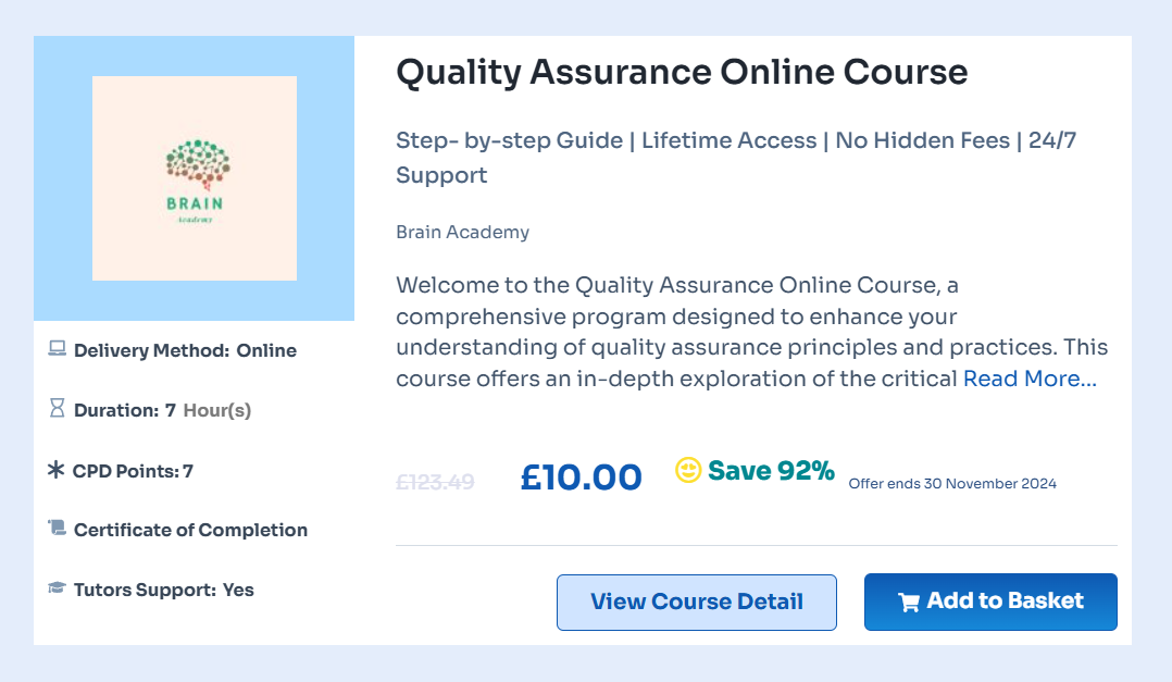 The Quality Assurance Online Course from Brain Academy provides a thorough understanding of quality assurance principles and practices crucial for ensuring product excellence and organizational efficiency. This fully online program allows you to learn at your own pace from anywhere in the world, covering essential topics like quality management systems, methodologies (including Six Sigma and Lean), quality audits, and compliance. The course features interactive modules, case studies, and expert instruction, equipping you with the skills to implement effective quality assurance strategies and contribute to organizational success.