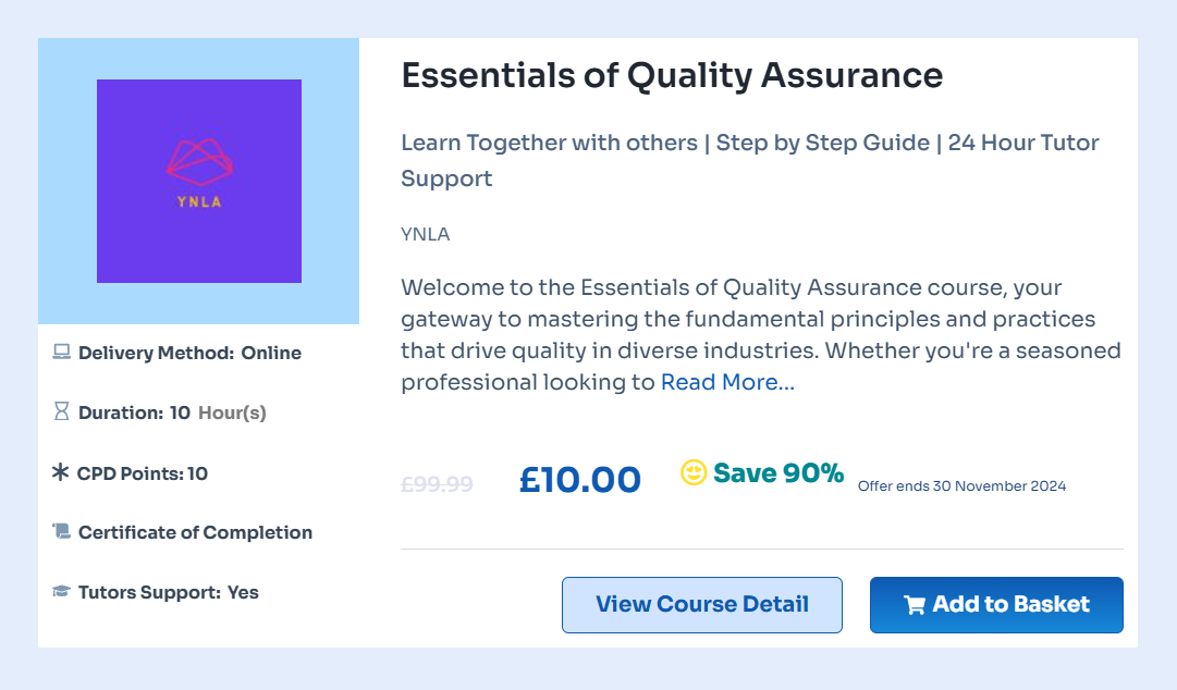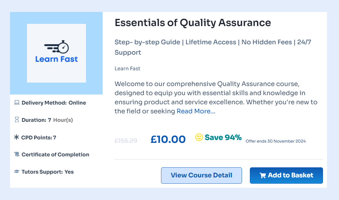 The Essentials of Quality Assurance course by Learn Fast delivers a comprehensive exploration of quality assurance principles, suitable for newcomers and experienced professionals alike. The curriculum emphasizes real-world applications, guiding participants through essential QA processes—from strategic planning to implementation. Learners will develop a thorough understanding of quality frameworks, improving organizational efficiency and customer satisfaction. With practical case studies and CPD accreditation, this course ensures you gain both theoretical insights and hands-on skills in quality management.