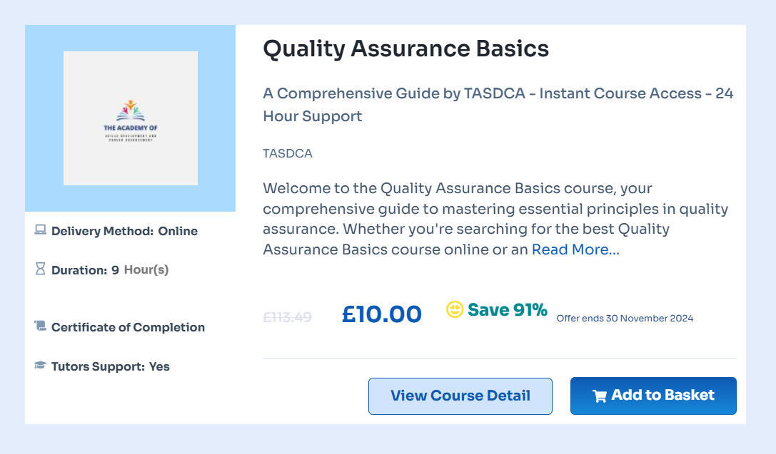 The Quality Assurance Basics course by TASDCA provides a comprehensive introduction to essential quality assurance principles. It covers key methodologies and tools for monitoring, improving, and maintaining product and service quality. Participants will explore quality control techniques, root cause analysis, and continuous improvement strategies, all through practical case studies. The program, led by experienced professionals, balances theoretical knowledge with real-world applications to prepare learners for effective quality management.