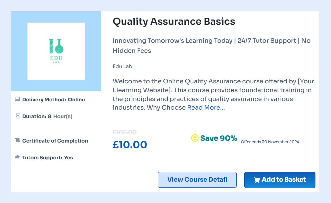 The Quality Assurance Basics course by Edu Lab delivers foundational training in quality assurance principles and practices, suitable for diverse industries. This comprehensive online program covers essential QA concepts, from quality control techniques and quality management systems to regulatory standards and audit procedures. Through interactive modules, case studies, and expert-led instruction, participants gain the skills to ensure product and service excellence. The course emphasizes practical applications, preparing learners to develop and implement effective quality assurance plans in real-world settings.