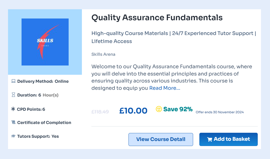 The Quality Assurance Fundamentals course from Skills Arena provides essential training in QA principles, equipping learners to implement quality practices across diverse industries. The curriculum focuses on key aspects, including quality standards, compliance, quality control techniques, continuous improvement strategies, and risk management. With practical exercises, simulations, and real-world applications, participants gain the knowledge and confidence to contribute to quality assurance efforts effectively. This CPD-accredited course ensures learners stay relevant and competitive in their professional roles.