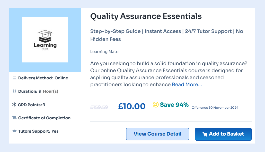 The Quality Assurance Essentials course, offered by Learning Mate, is designed to provide both aspiring quality assurance professionals and experienced practitioners with a solid foundation in quality assurance principles. The course covers essential topics that apply across various industries, including manufacturing, software development, and healthcare. Delivered by industry experts, this comprehensive program ensures participants gain the skills needed to implement effective quality assurance processes, enhancing their professional capabilities and career prospects.