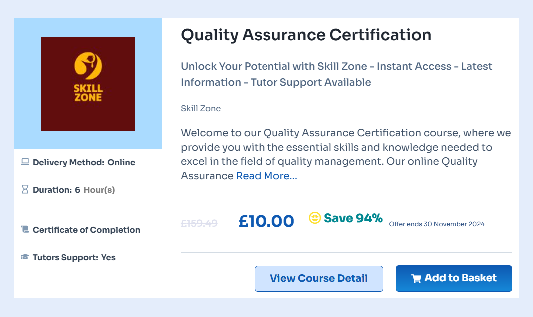 The Quality Assurance Certification course from Skill Zone equips participants with the essential skills and knowledge needed to excel in quality management. Designed for professionals aiming to deepen their understanding of quality control and assurance processes, this online course emphasizes practical applications aligned with industry standards. Participants will learn how to tackle real-world challenges in quality management, making them proficient in quality assurance methodologies. The certification is globally recognized, enhancing career opportunities for learners in the UK and beyond.