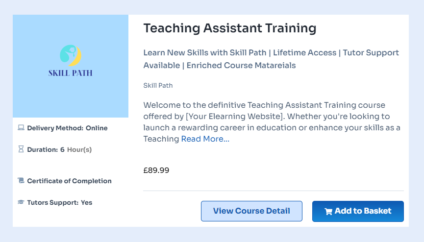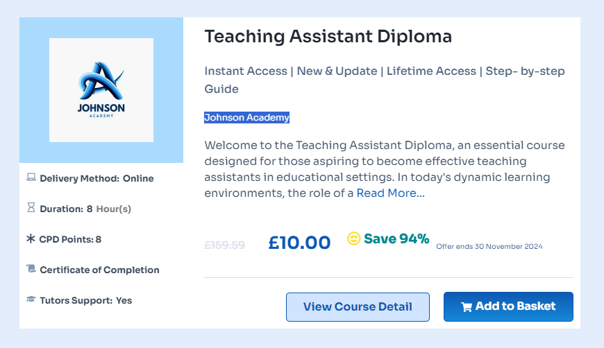 Teaching Assistant Online Course offers a great starting point for anyone interested in becoming a teaching assistant. This online course is flexible and self-paced, making it easy to balance with other commitments while gaining the skills needed for this vital role.