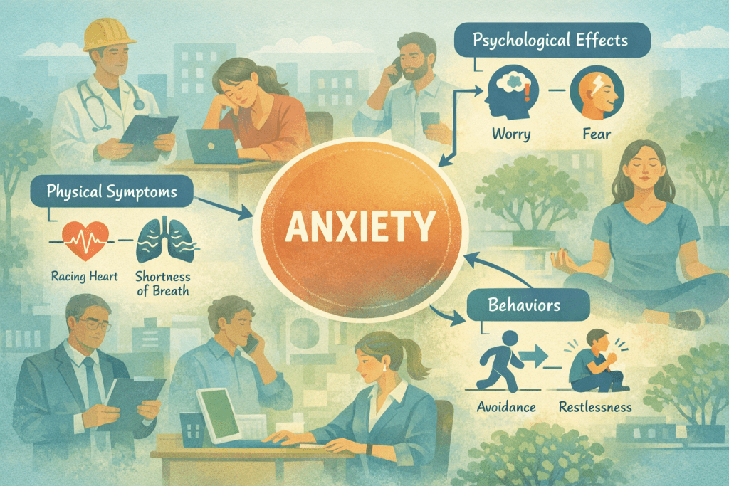 Recognise Symptoms: Anxiety manifests through physical, emotional, and cognitive symptoms such as restlessness, difficulty concentrating, irritability, and muscle tension.